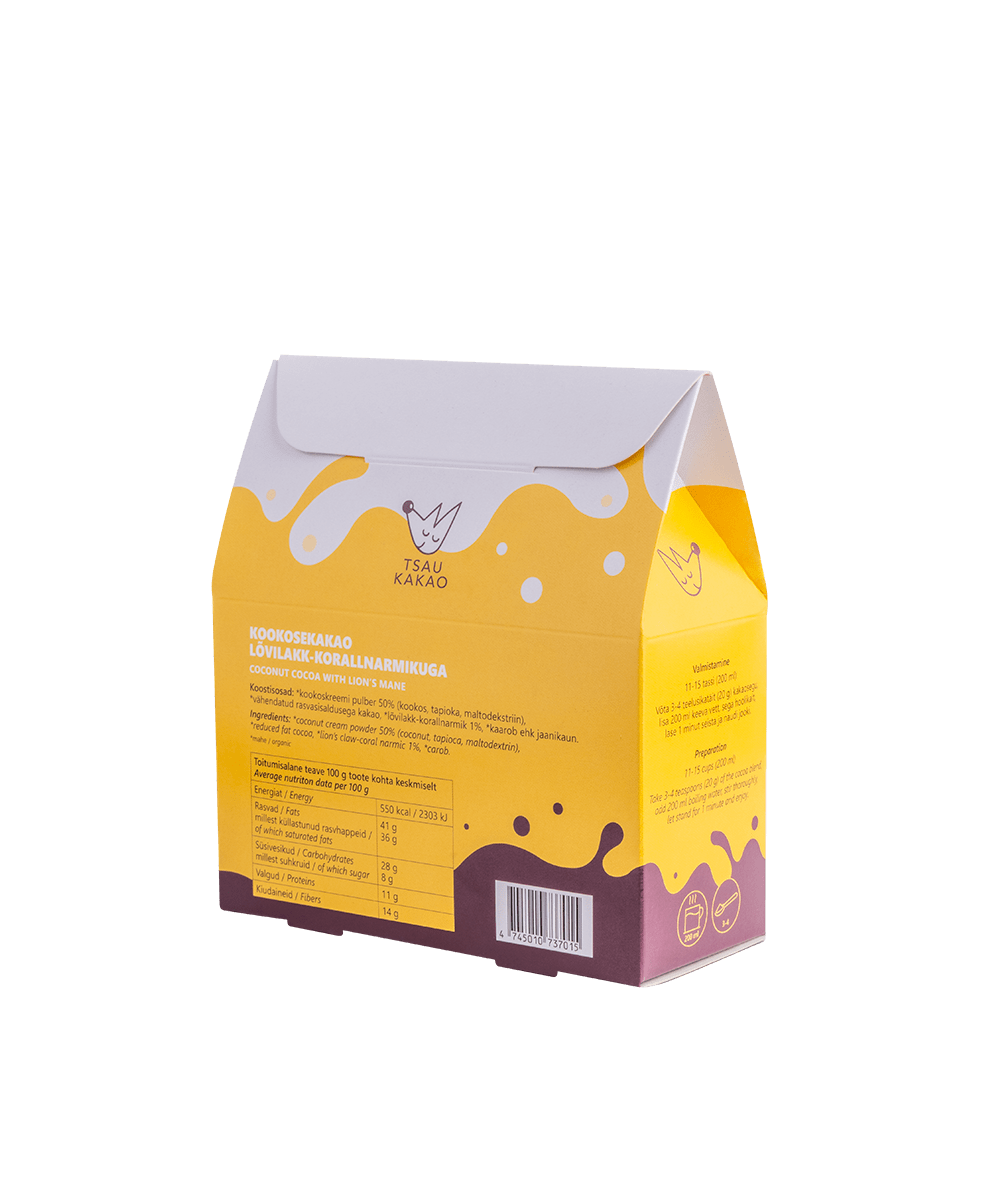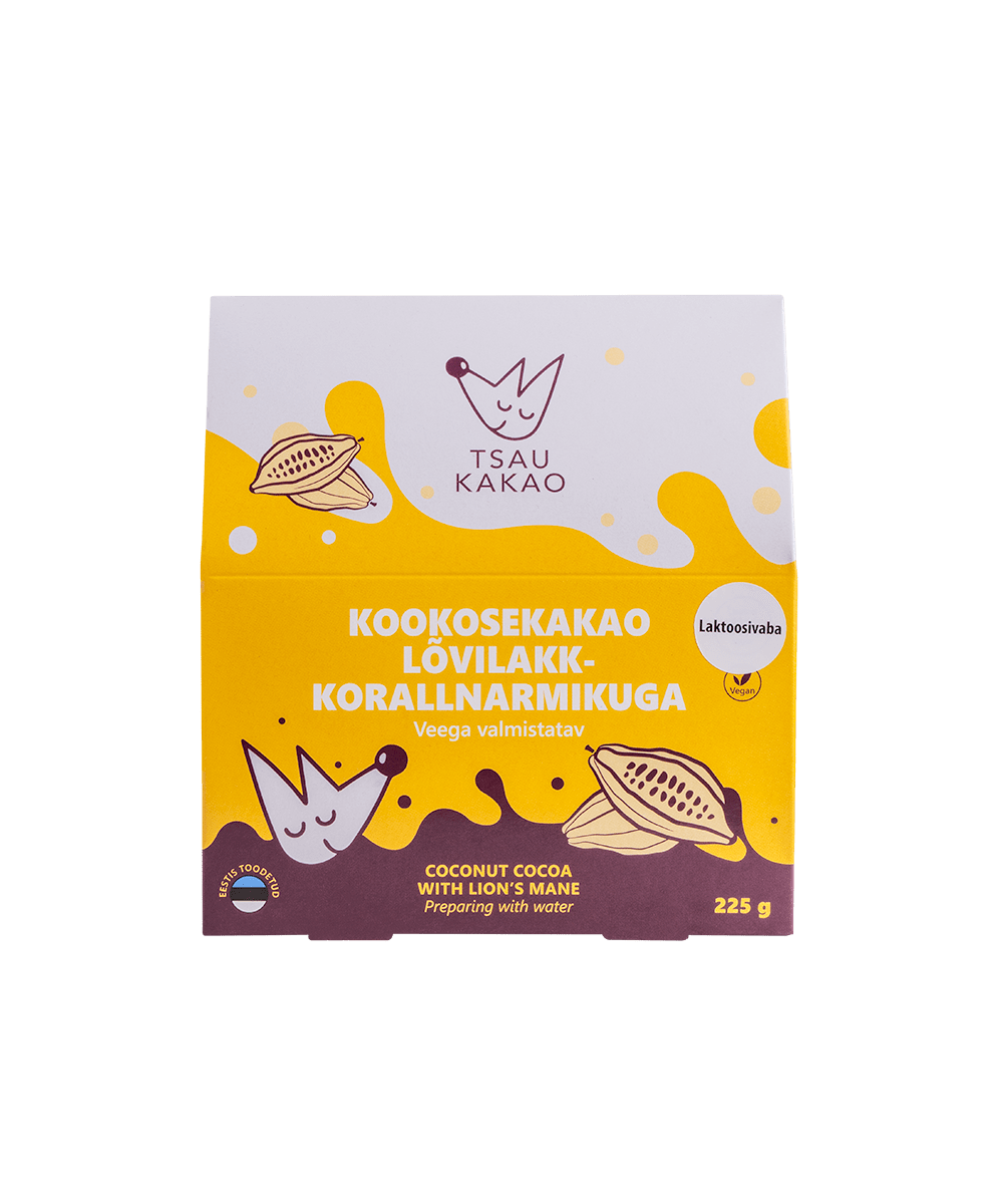 See vegan kakaosegu sisaldab kookosepiimapulbrit, jaanikauna ja funktsionaalseks lisandiks tuntud lõvilakk-korallnarmikut (Lion’s Mane).